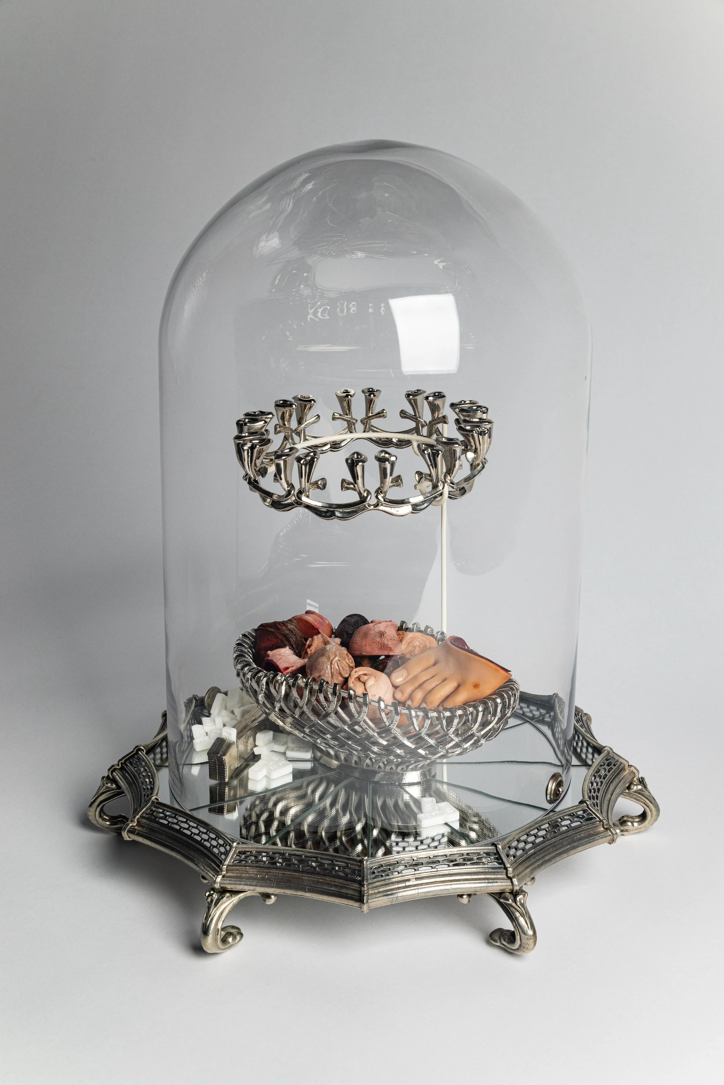 Inside the parlor dome I displayed a grouping of autobiographical objects, collected between 2000 to 2021. An electroplated crown symbolized personal triumphs and milestones in my life, with the electroplating suggesting themes of transformation and preservation. Early versions of flesh-like chocolates cradled in an electroplated 3D-printed basket combined organic and technological elements to reflect my exploration of identity in the age of digital and biotechnological advancements.